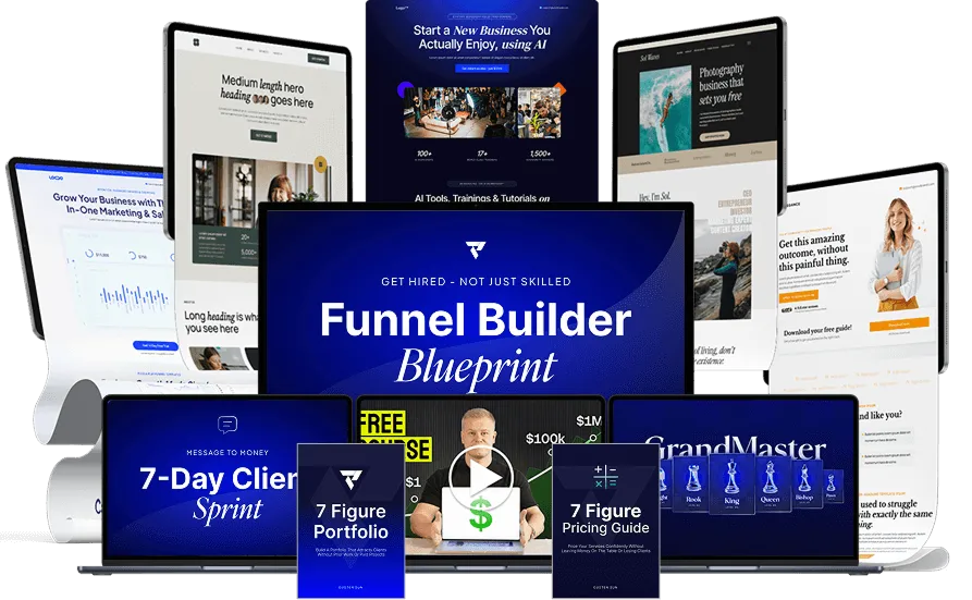 The Funnel Builder Blueprint is a complete system that teaches you how to build funnels AND how to get hired to build them for clients. Unlike other courses that just teach you the technical skill, this includes the complete client acquisition system — what to say, where to find clients, what to charge, how to position yourself, and how to structure your services.